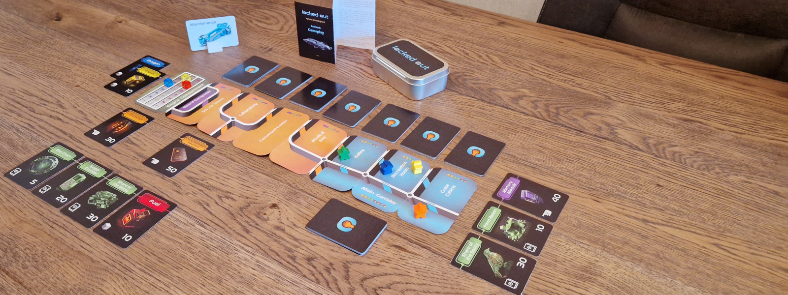 Locked Out is a game for 3-6 players. Players explore the spacecraft and pick up potentially useful items. They must gather the correct combination of items to win the game, but pocketing items for their monetary value may be too great a temptation...