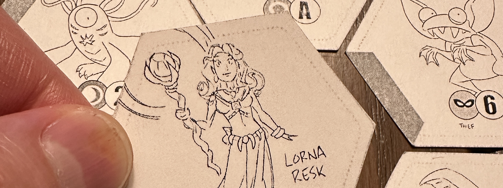 Description/Overview: Lorna Hex chases a mob of creatures as they take the magical treasure from her village into the haunted, magical Cave of Zudora! The cave is represented by a bag full of tiles. Because it is dark, Lorna can only see what is illuminated by her magic staff as shown by tiles drawn from the bag and placed in a circle around her. The race is on as the Master of Alphas increases his power by building his army of telepathically controlled creatures. Lorna can move onto enemy creatures and rescue them from the Master’s control, making them allies. Once rescued, Lorna can share magic items with creatures or friends to increase her skills.