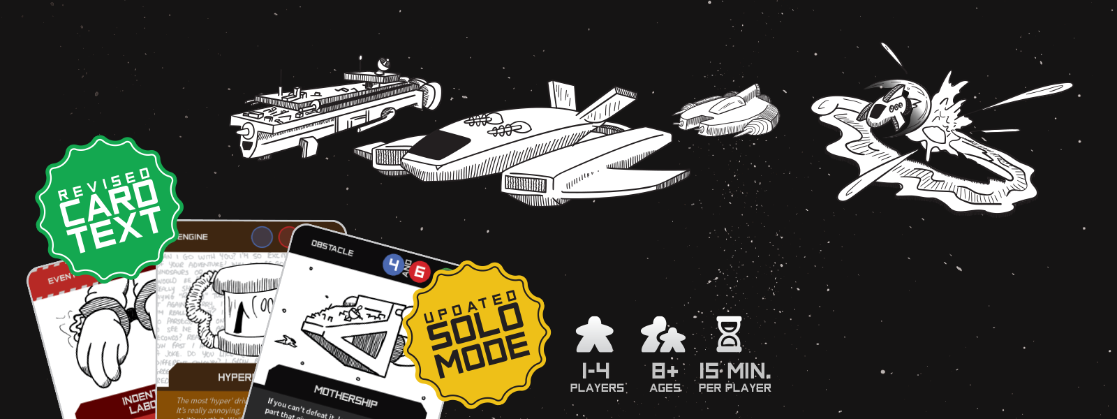 This is simple competitive sci-fi game for 1-4 players. You're trying to escape your home planet and get to a new planet. It's a fast paced game, where the tables can turn any minute. You can help or sabotage another player, outfit your ship with the best ship parts you can, enhance the performance of your shield, weapons, or engine with performance enhancers. Play with the included events expansion to add some variety to your game.