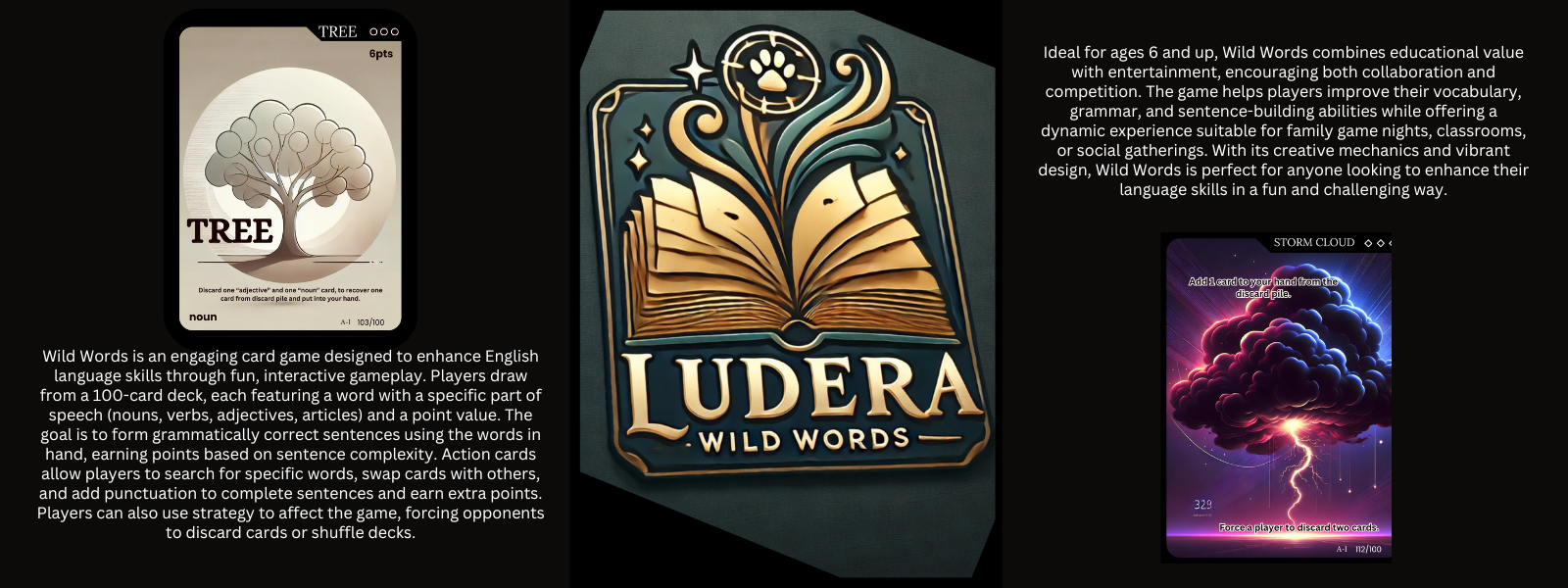 Wild Words is an engaging card game designed to enhance English language skills through fun, interactive gameplay. Players draw from a 100-card deck, each featuring a word with a specific part of speech (nouns, verbs, adjectives, articles) and a point value. The goal is to form grammatically correct sentences using the words in hand, earning points based on sentence complexity. Action cards allow players to search for specific words, swap cards with others, and add punctuation to complete sentences and earn extra points. Players can also use strategy to affect the game, forcing opponents to discard cards or shuffle decks.