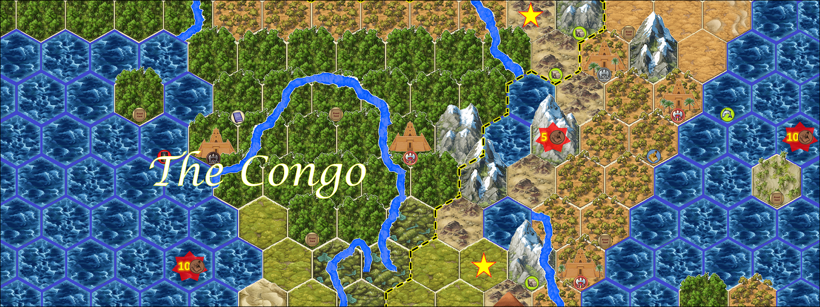 In this map pack for Magnus Rex, the modular map is replaced by 2 bi-fold boards. This African map has "true start" locations for the following factions: