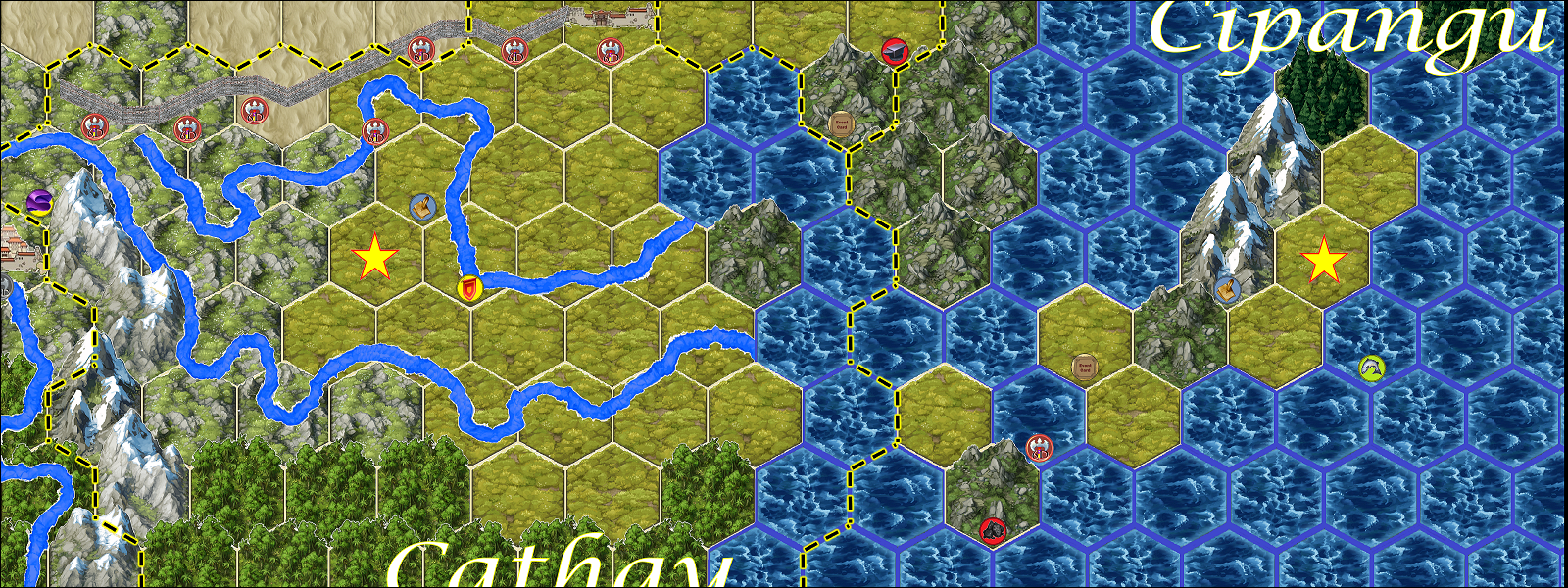 In this map pack for Magnus Rex, the modular map is replaced by 2 bi-fold boards. The map contains East Asia and the Indian subcontinent, and has "true start" starting locations for these factions: