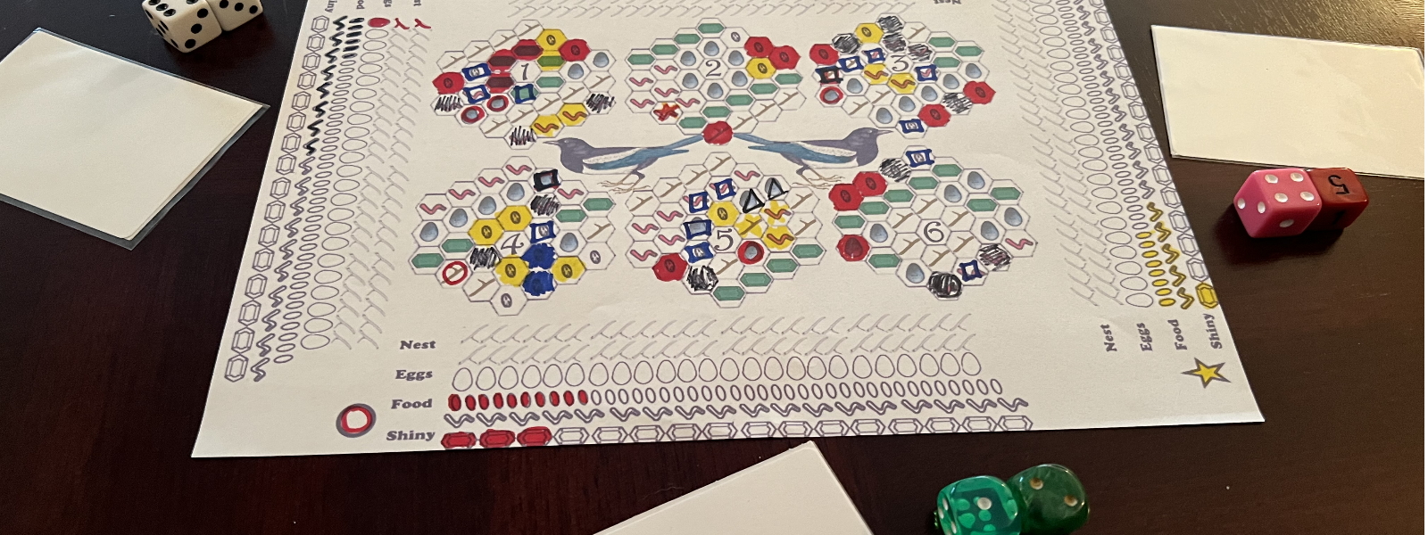In Magpie, players will all be playing on the same sheet. Players should position themselves so that each player, up to 4, has their symbol and potential resources in front of them.