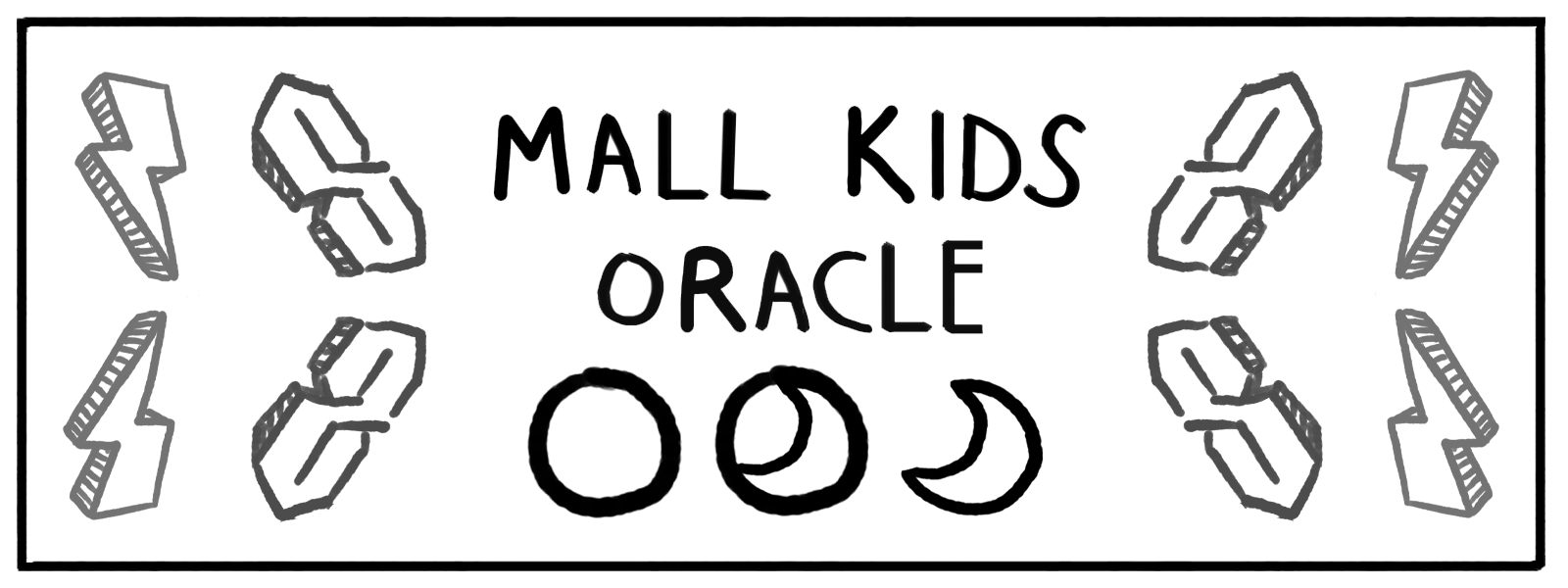 Mall Kids Oracle is an 18-card simplified oracle deck based on the art of Mall Kids and pulls from 90's mall nostalgia. Use images like The Boss, The Symbol, and The Snack to divine your path.