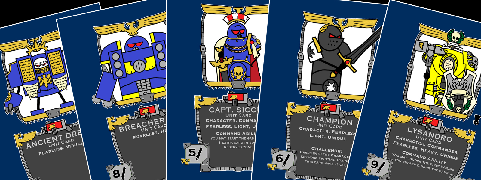WMS is a card game in which the characters from the Wobbly Model Syndrome comics are pitched against each other in a series of fights. Lead by heroic commanders, the “armies” of both players rage against each other until one commander is reduced to zero wounds.