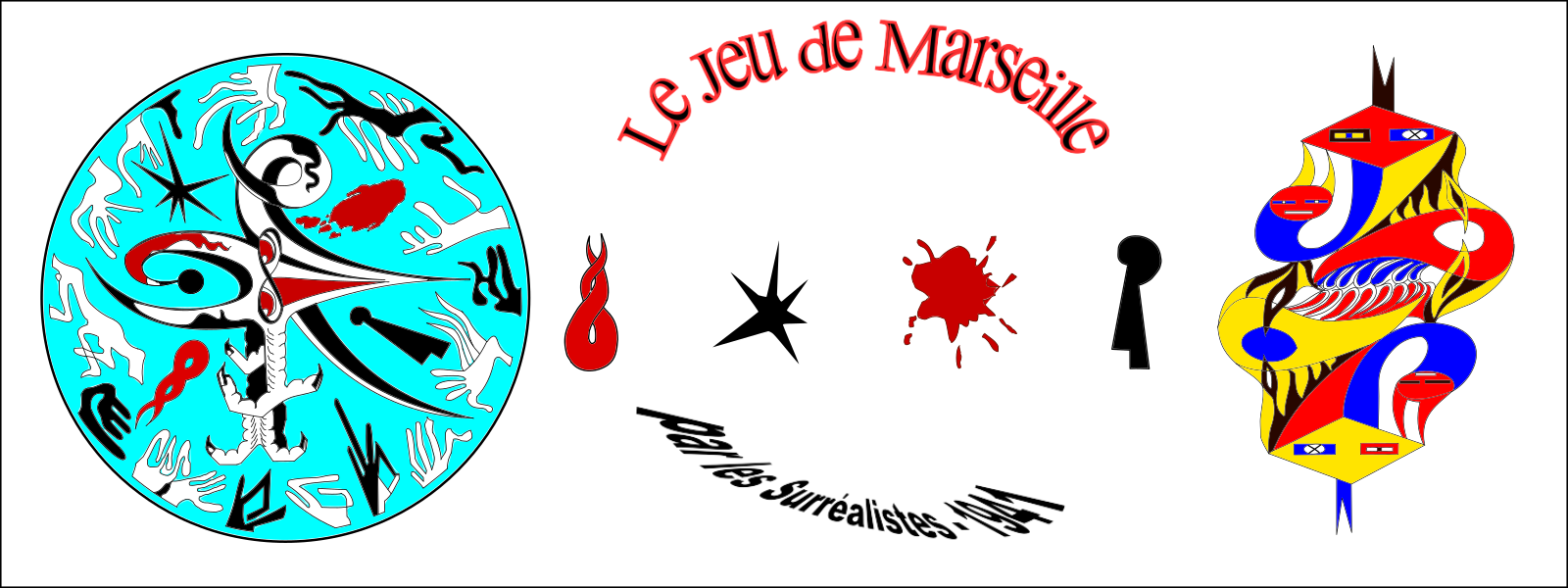 In 1941 André Breton and a group of Surrealist artists (Wifredo Lam, Max Ernst, Jacqueline Lamba, Oscar Dominguez, Victor Brauner, Jacques Hérold, André Masson and Frédéric Delanglade) were stranded in the French port of Marseilles whilst attempting to escape Nazi-occupied Europe and gain passage to America. Having deconstructed traditional, bourgeois playing card symbolism they produced new, liberated designs expressing their own beliefs and values. The court cards were persons representing new, revolutionary ideals. The conventional courts were re-named Genius, Siren and Magus. The suits are: Locks (Black) to represent knowledge; Stars (Black) dreams; Wheels (Red) revolution and Flames (Red) love.