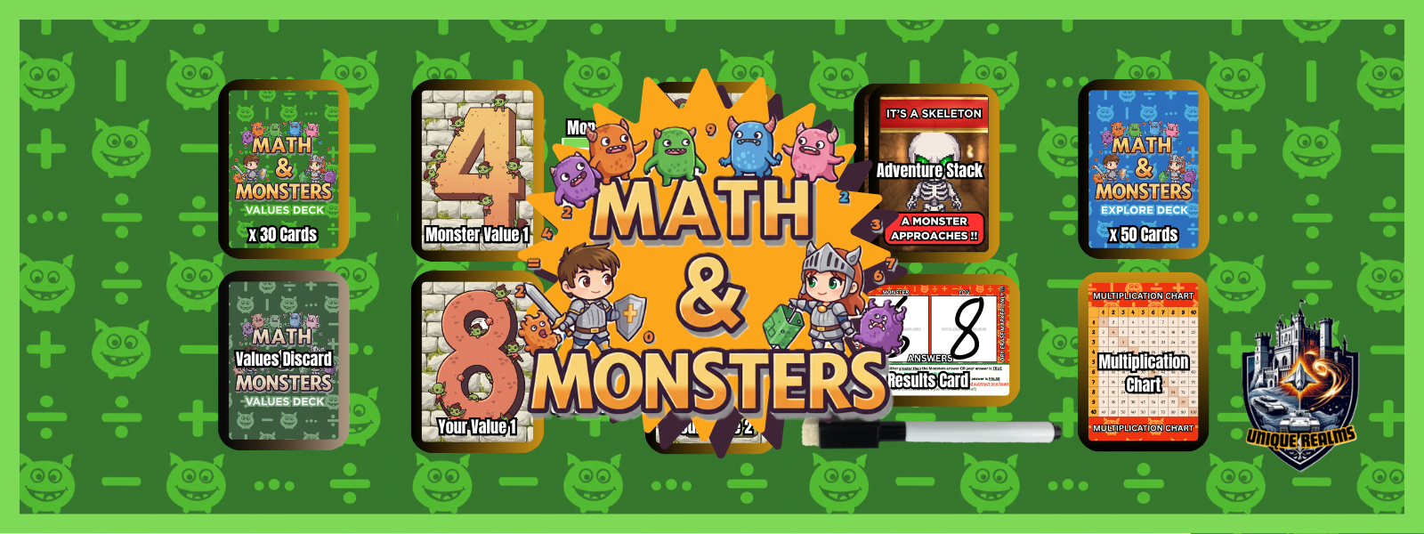 Math & Monsters makes math practice exciting by turning it into a dungeon adventure! Students explore a deck of cards, battle monsters with math problems, and race to find the Exit before losing all their Hearts. Every battle is solved through equations created with number cards and dice, giving kids a fun way to practice addition, subtraction, multiplication, division, and comparisons.