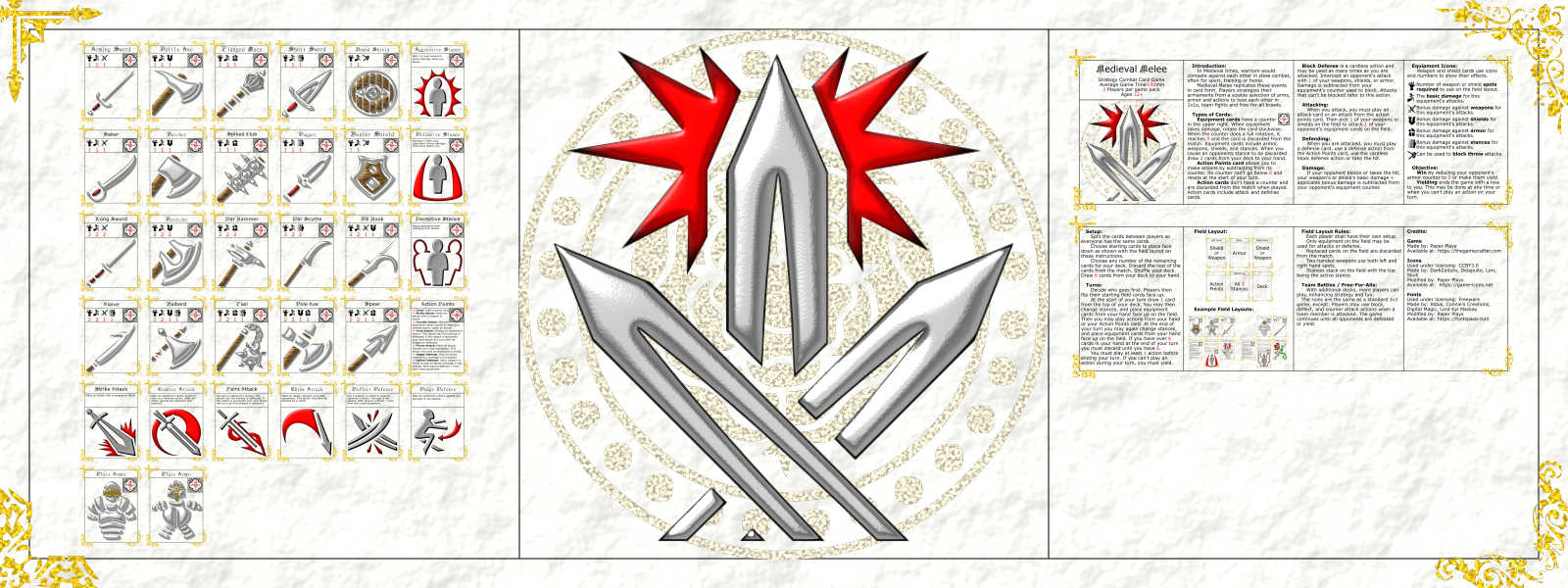 In Medieval times, warriors would compete against each other in close combat, often for sport, training or honor. Medieval Melee replicates these events in card form. Players will choose their armaments from a sizable selection of arms, armor, and actions to best each other in strategic combat. This pack of 86 cards contains everything for 2 players to go 1v1. Additional packs allow for more players, team fights and free-for-all brawls