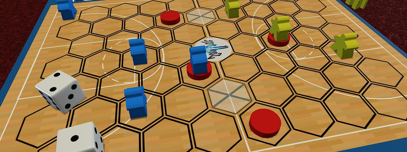 Players take turns rolling dice to see how much their Meeples can move across their side of the gym and then roll dice to see how far they can throw the balls at their opponent.
