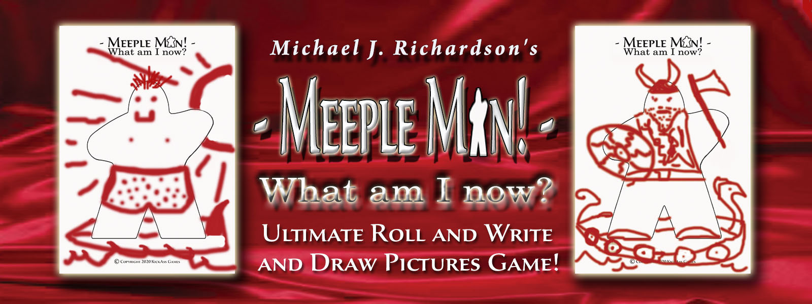 The owner of the game, or the first person who wanted to play this KickAss game, is the first person to “Roll and Draw”, who then draws on their card Blank Card for all other Players who “Write” on their Score Card what they think Meeple Man is now. All Players must deduce what the “Meeple Man” is, (“What am I now?”), and write it down on the reverse of the Blank Meeple Man card in line 1, “Position 1” with a Whiteboard marker. The next answer is written in line 2 until eight cards have been drawn and the 8 lines have been filled in to get a Total Score for this Game.