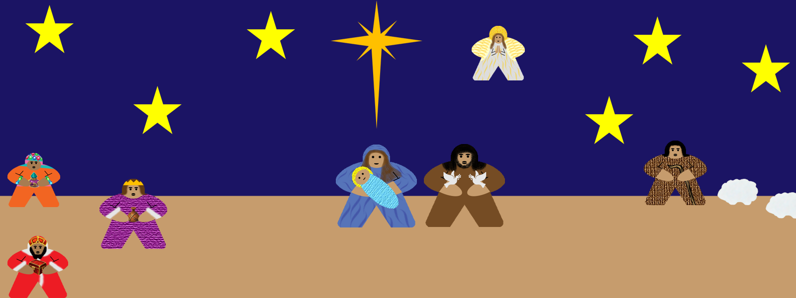 Make Christmas extra special with a nativity set that uniquely reflects who you are. The Meeple Nativity includes eight 17 mm wooden meeples representing Mary, Joseph, Baby Jesus, a shepherd, an angel, and the 3 wise men. Also included are a cow, a donkey, 2 sheep, 2 bales of hay, a wood pile and a star. And they all fit easily into a custom mint tin.