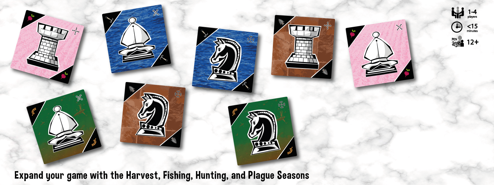 Featuring 4 entirely new sets of cards, you can expand your game even more with the Harvest, Fishing, Hunting, and Plague Seasons!