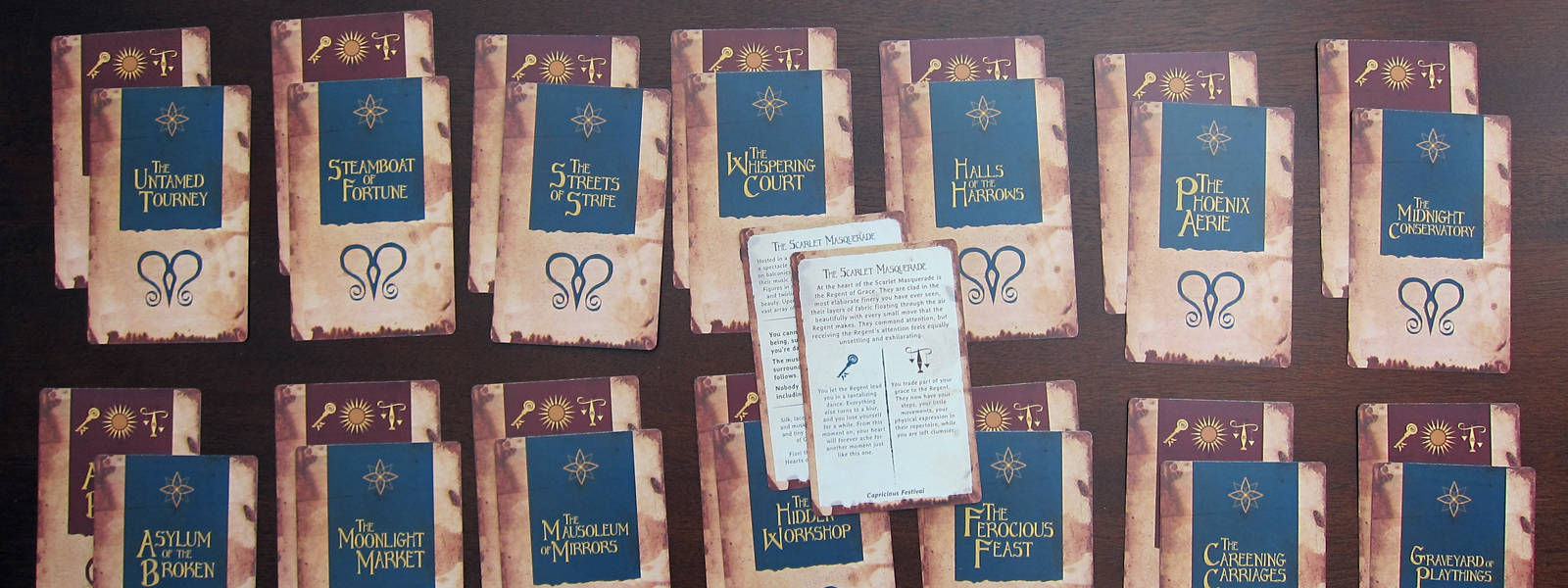 3 sets of Journeyer cards (Defiance, Obsession, Devotion) 1 set of Guide cards 3 Touch cards 5 sets of Companion cards 54 cadences in 3 sets: Quirky Creatures, Fleeting Moments, and Dread&Doubt 17 Locales in 3 sets: Capricious Festival, Bumpy Rides, and Dark Reflections 1 rulebook