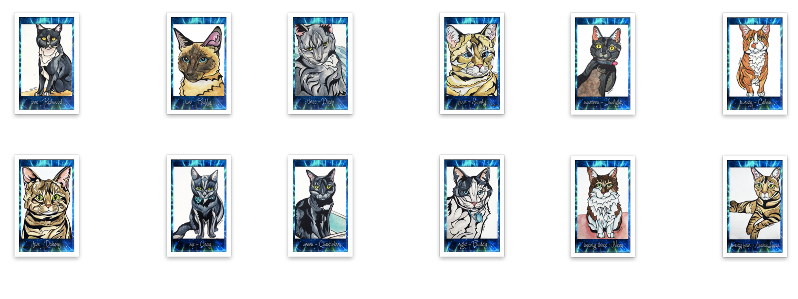 Cats in this deck: 1 Redwood 2 Buffy 3 Diego 4 Sandy 5 Dakory 6 Gray 7 Chanticleer 8 Buddy 9 Turkish Kitten 10 Tia 11 Rafina 12 Lilly 13 Kitty Kisser 14 Neptune 15 Neko 16 Jinxx 17 Kiki 18 Sophie 19 Twilight 20 Calvin 21 Princess 22 Penny 23 Nena 24 Anakin Lucas 25 Karma 26 Tom Selleck 27 Hammy 28 Elvis 29 Delilah 30 Fluff 31 Ivy Marie 32 Grey Kitten 33 Linus 34 Lucy 35 Stuart 36 Jinger