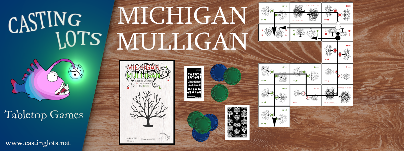 MICHIGAN MULLIGAN uses special playing cards to move pawns along an ever changing GAMEBOARD. If the GAMEBOARD fails to provide a clear way to the finish line, take a MULLIGAN and create your own path to victory. MULLIGANS also provide the most opportunities for points along the way by matching fruit and numbers.