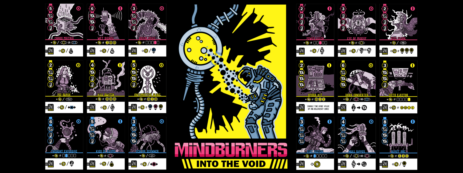 Mindburners: Into the Void is a strategic cyber-occult card drafting and arrangement game for 1-2 players. Loaded up with experimental gear and thrust into the swirling chaos beyond against your will, you must equip and optimize your limited void-tech and outperform your adversary.