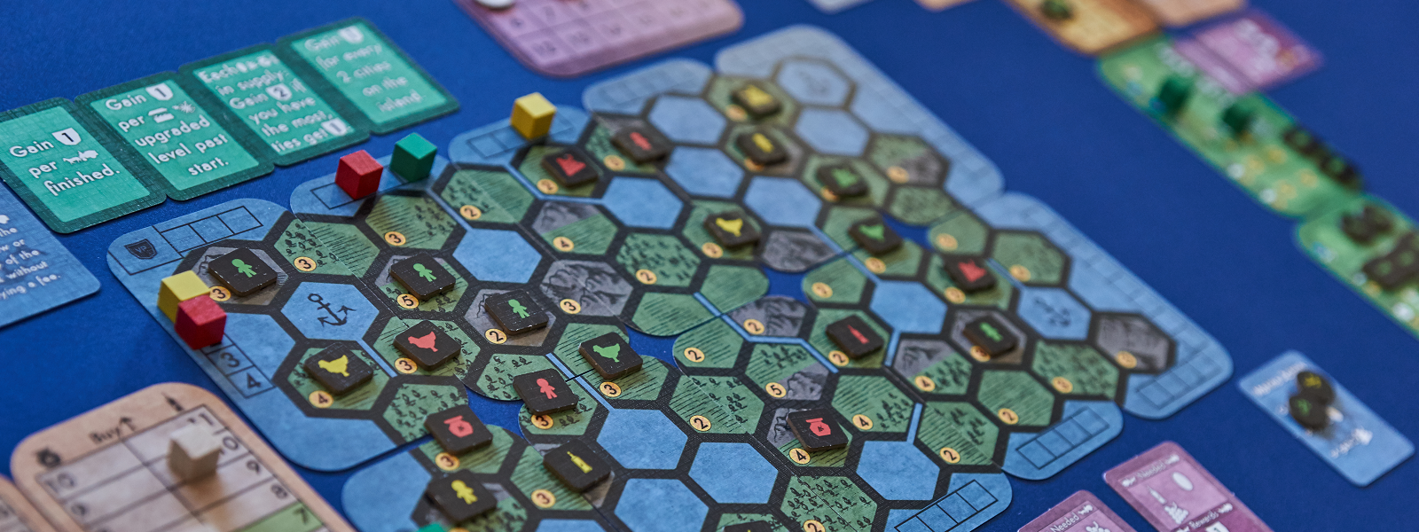 Players must increase their wealth, upgrade their abilities, trade or produce goods, complete contracts, and compete for land in this engine-building strategy game.