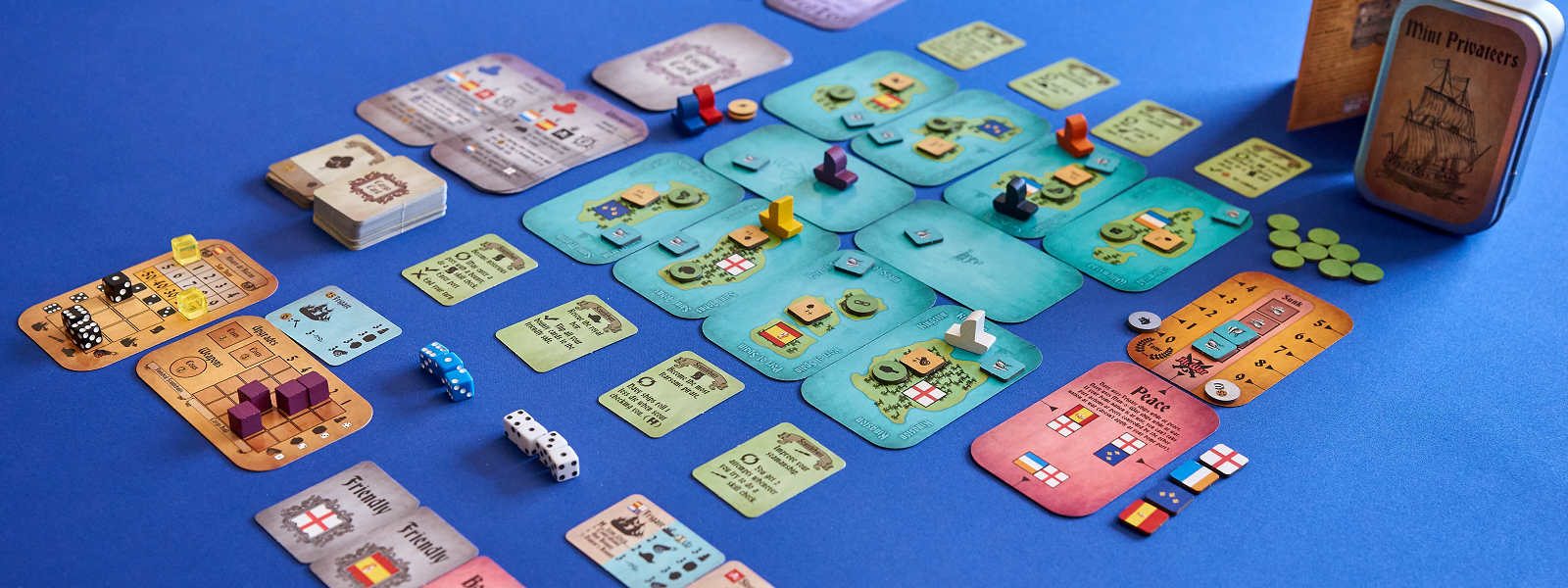 No two games will be the same. During event resolution, events are resolved using 2 cards orginated from a shuffled deck to dictate what happens on that turn of the game. The map setup, story cards (objectives), upgrade tokens, merchant ships, in demand goods, and scuttlebutt cards are all randomized during game setup.