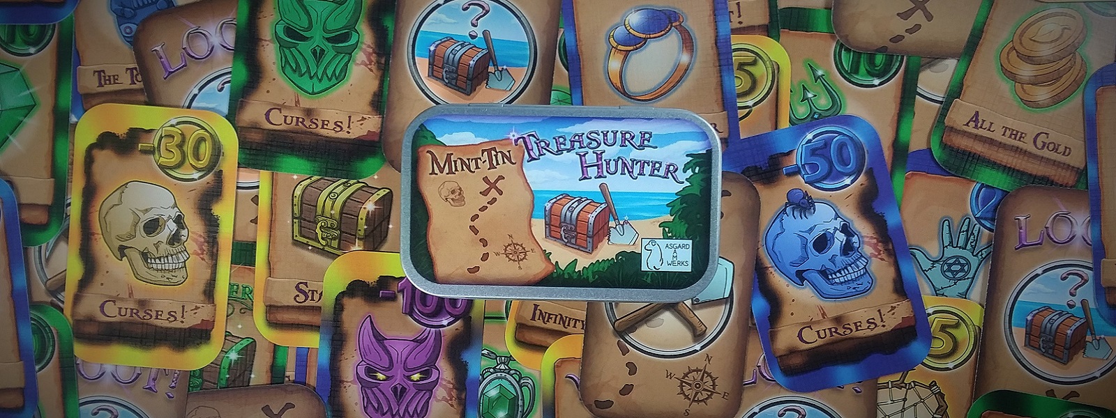 In Mint Tin Treasure Hunter you and your fellow players will search for and discovery mysterious treasures and relics. Collect as many unique items as you can to earn points, but look out for any cursed items of dark origins, as they can take away from your overall wealth. Cursed treasures can be passed on to fellow players for them to deal with.