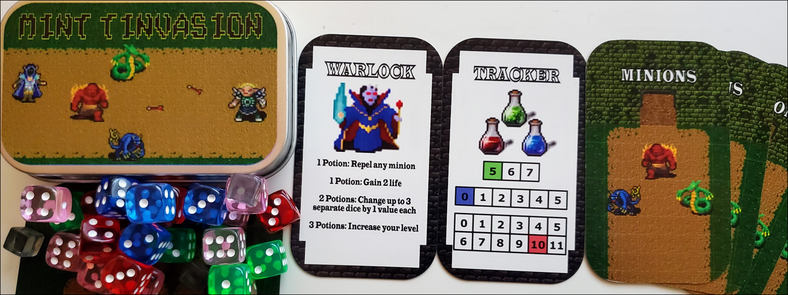 Mint Tinvasion is a solo tower defense game based around a deck of cards and a handful of dice.