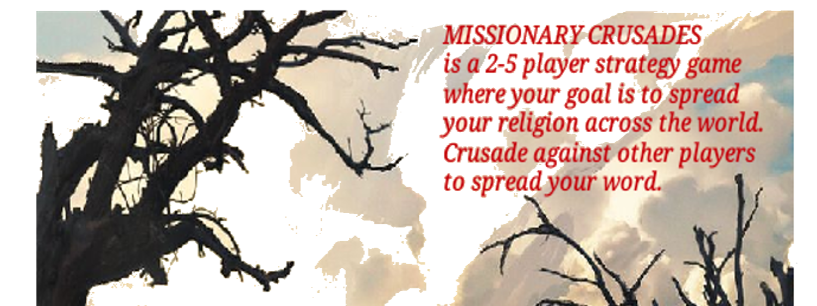 You ever wish there was a strategy game that didn't take a half hour to set up and hours more to play? If so look no further than Missionary Crusades.In Missionary Crusades you are tasked with creating your own religion in which to spread across the map. Easy to learn rules and gameplay allow for easy set-up and an average play time of 45 minutes to a hour. Missionary Crusades is a 2 to 4 player strategy game for those 12 and up. Crusade against other players to convert the entire map. The Game Mat is a map of 14TH century medieval Europe and has 36 territories to convert. Game also includes a eight card perk deck that rotates to players throughout the game.