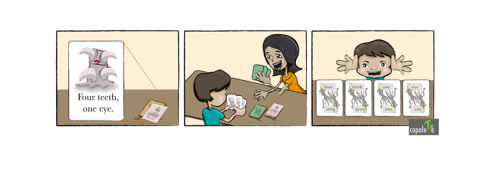 These monsters have something to say about themselves and each other! The goal is to find all the words in the monster's statements. There are three different ways we've figured out to play with this deck of cards, and we're quite sure some of you can come up with more. Our personal favorite is the Fast Gab. It's the fastest-paced, funniest, and potentially most painful since it involves a race to slap the cards. For the most part, though, when a hand is slapped instead of a card, laughter ensues!