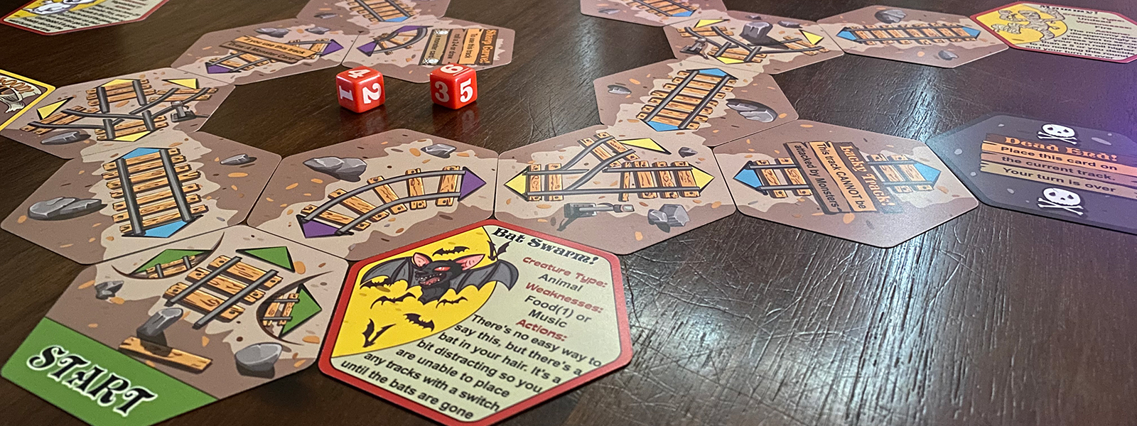 The objective of the game is to place enough track cards to escape the mine. The number of tracks you'll need will vary depending on the number of players but the gameplay remains the same. The monsters, the natural disasters and the mad scientist will all be working against you.