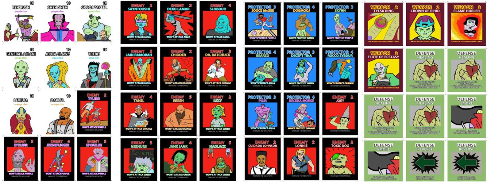 Characters belong to one of four Clans: Orange • Aqua • Purple • Green