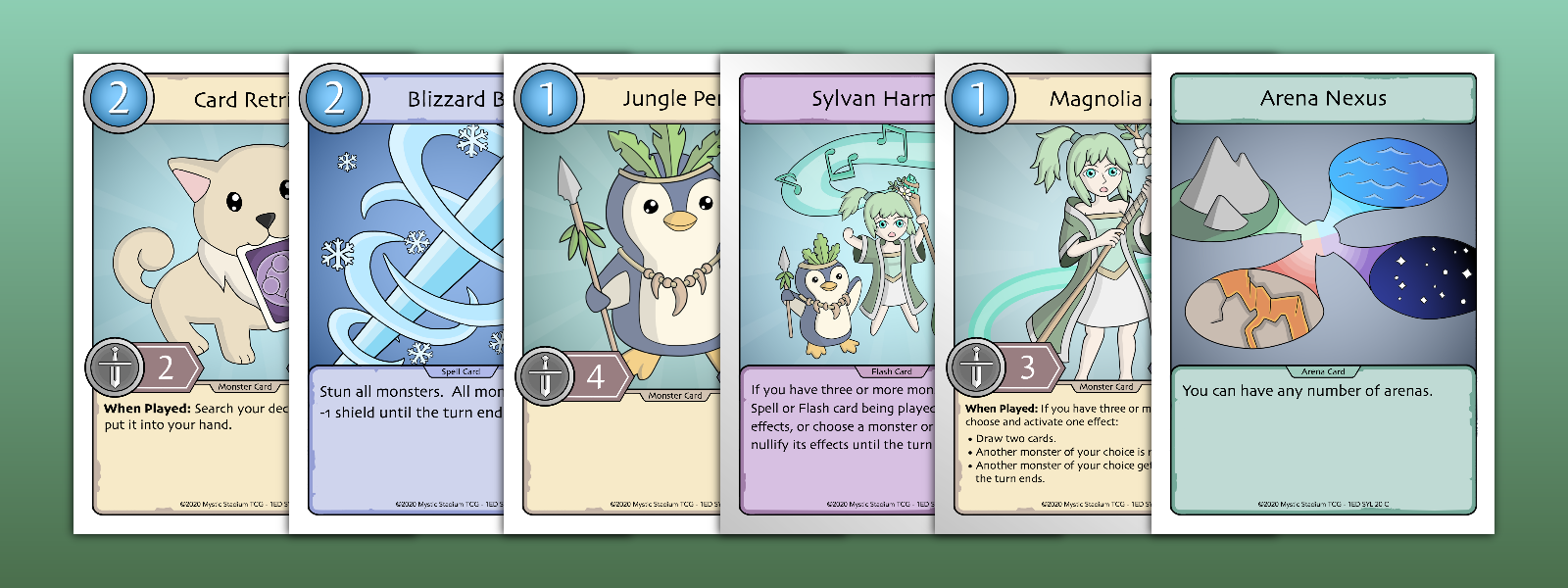 Mystic Stadium TCG is a fast-paced, easy to learn trading card game. Each card features unique artwork and there are no forced archetypes, so a deck can be built from any two booster packs!