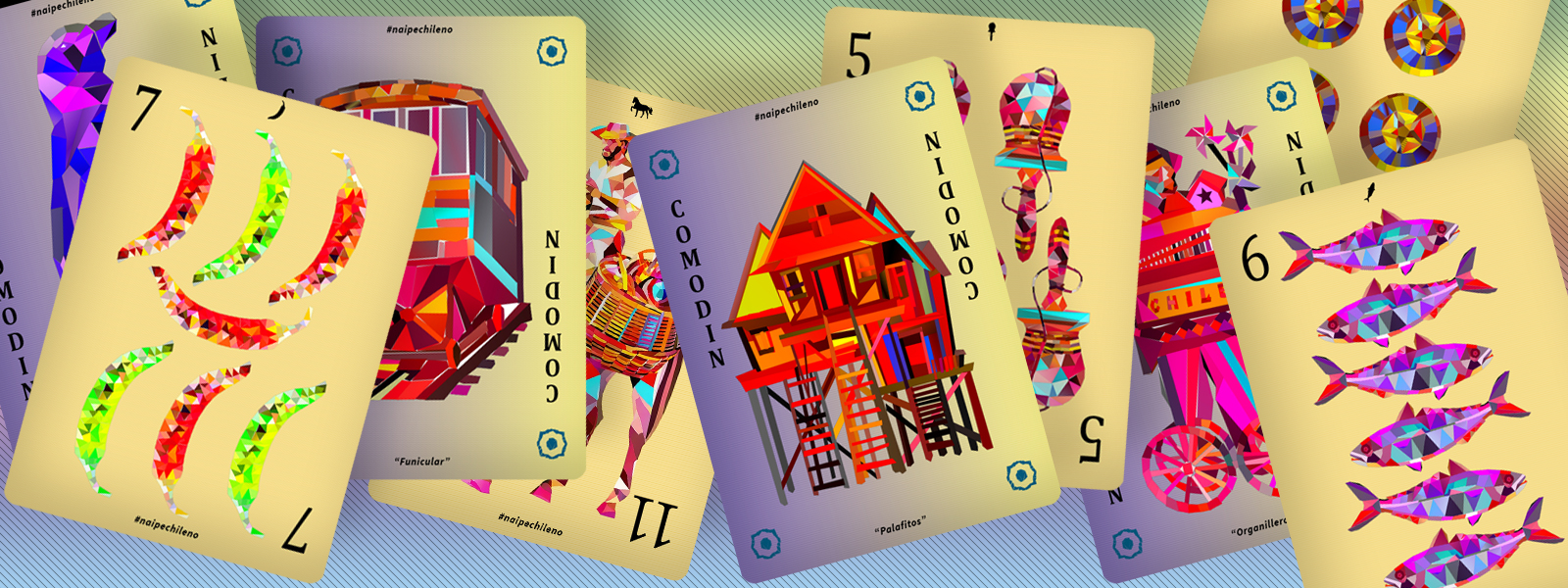 MVS PPK77. This is a multiverse edition of Naipe Chileno emulating the collage technique, it includes: 12 Jurel cards, 12 Ají cards, 12 Tejo or Rayuela cards, 12 Emboque cards. Plus 4 wild cards: Organillero, Palafitos, Funicular, and Pingüino de Humboldt.