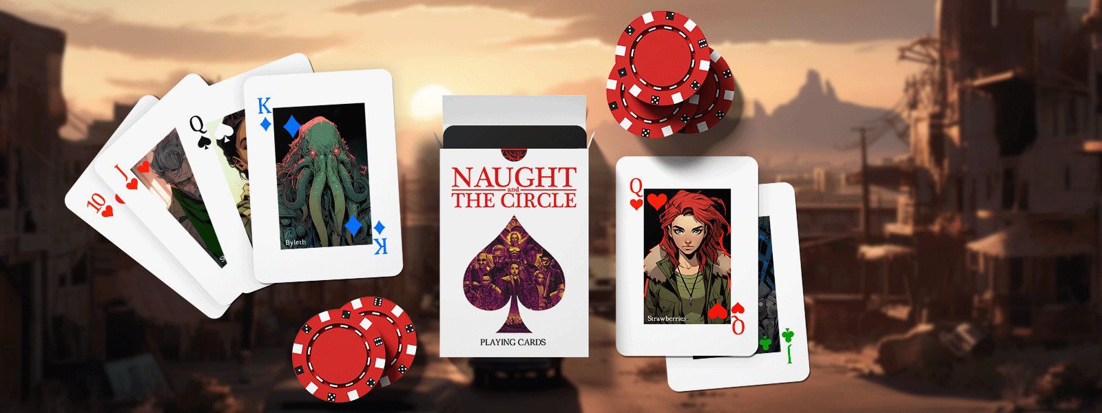4 color suits, 15 face cards displaying exclusive illustrations from the novel Naught and the Circle by Kell Martin.