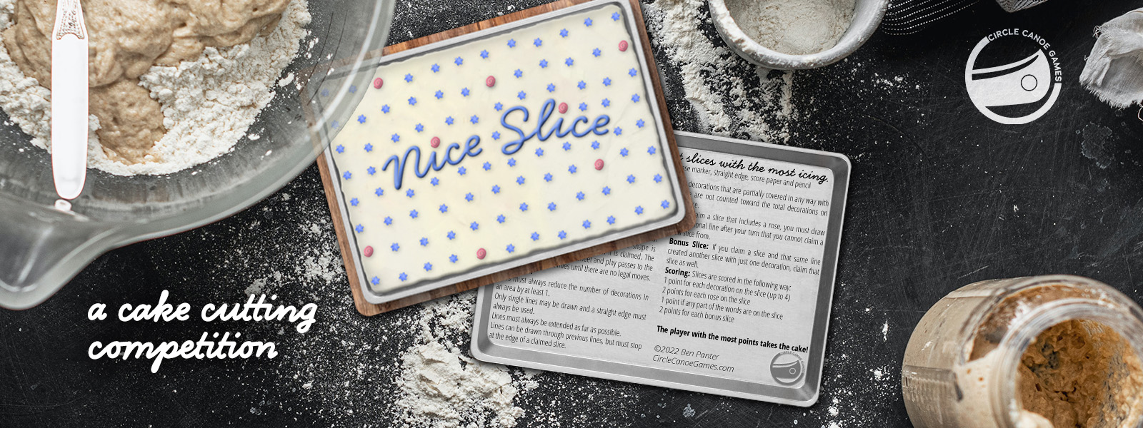 Bonus Slice: If you claim a slice and that same line created another slice with just one decoration, claim that slice as well. Scoring: Slices are scored in the following way: 1 point for each decoration on the slice (up to 4) 2 points for each rose on the slice 1 point if any part of the words are on the slice 2 points for each bonus slice