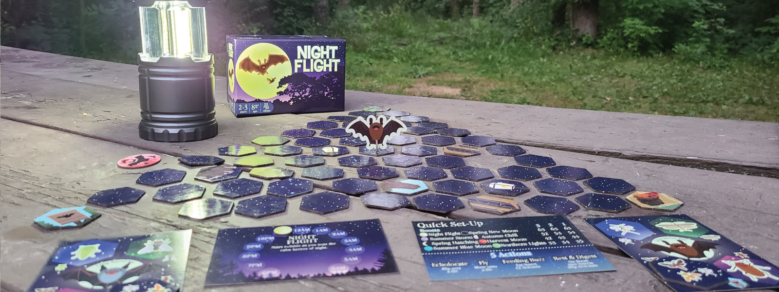 Choose an Environment Card and its Moon Token to get started. Based on the Environment Card and the number of players, set up the Night Sky with the correct number of tiles. Roosts are placed on the corners of the Night Sky. Bats are placed on their roosts and the Moon Token always starts at 6PM on the Environment Card.