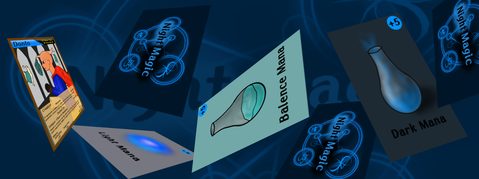 The Land was once peaceful and filled with happy, joyful people and creatures singing and dancing... until Nightfall and the moon rose. This night the land was attacked by magical creatures led by a strong dark being and everything was set ablaze destroying homes of the once joyful people. But there was hope a hero rose up from the flames that caught fire of the surrounding homes which now has spread for miles. The two fought with powerful magic and this night was called Night Magic... They threw cards on the ground thus through magic creatures, Spirits, and spells are used and Summoned as they fought. As time went on the fire died the smoke cleared, and the sun rose and it was clear one of them became victorious....