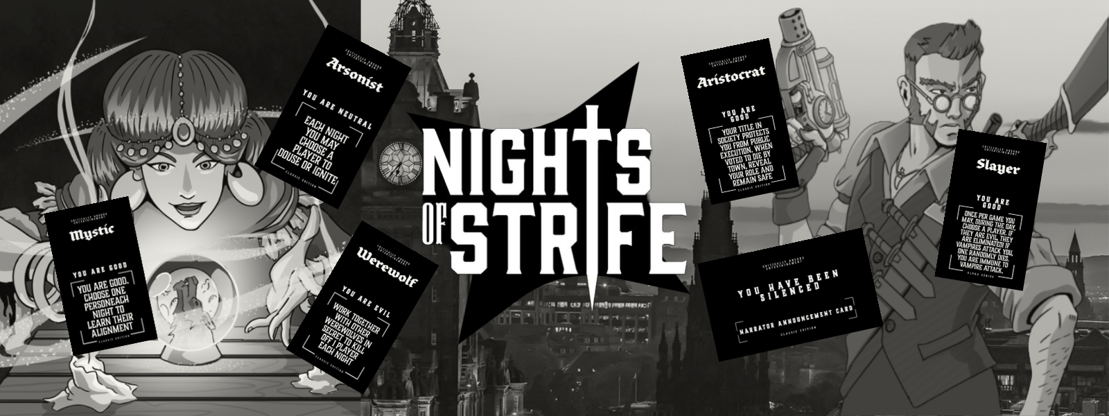 Nights of Strife is a period of civil unrest set in the 1890’s Europe, in a town permeated with evil, where creatures lurk in the shadows just beyond the light of the sun. Monstrous abominations that hunger for your flesh and your blood, Werewolves and Vampires, prowl the night, going from door to door to drag some poor townsfolk into the night kicking and screaming.