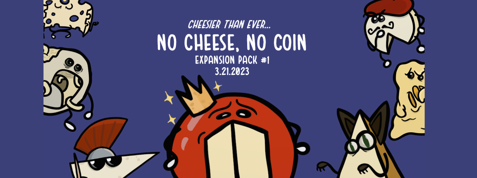 No Cheese, No Coin fantasy expansion pack is an expansion of the base No Cheese No Coin Game. Seven new cheeses and a new coin card makes up this pack.