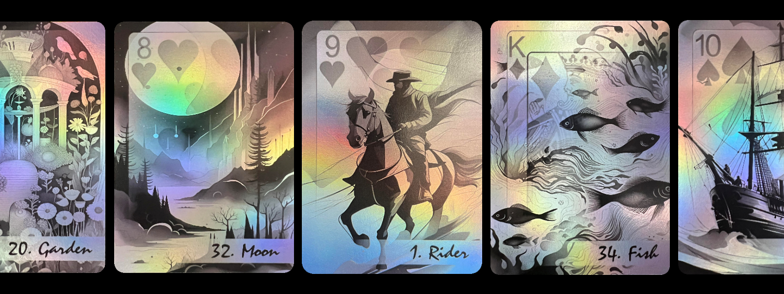 The Obsidian Reflections Lenormand Foil Card Deck. Monochromatic art with a holographic iridescence.