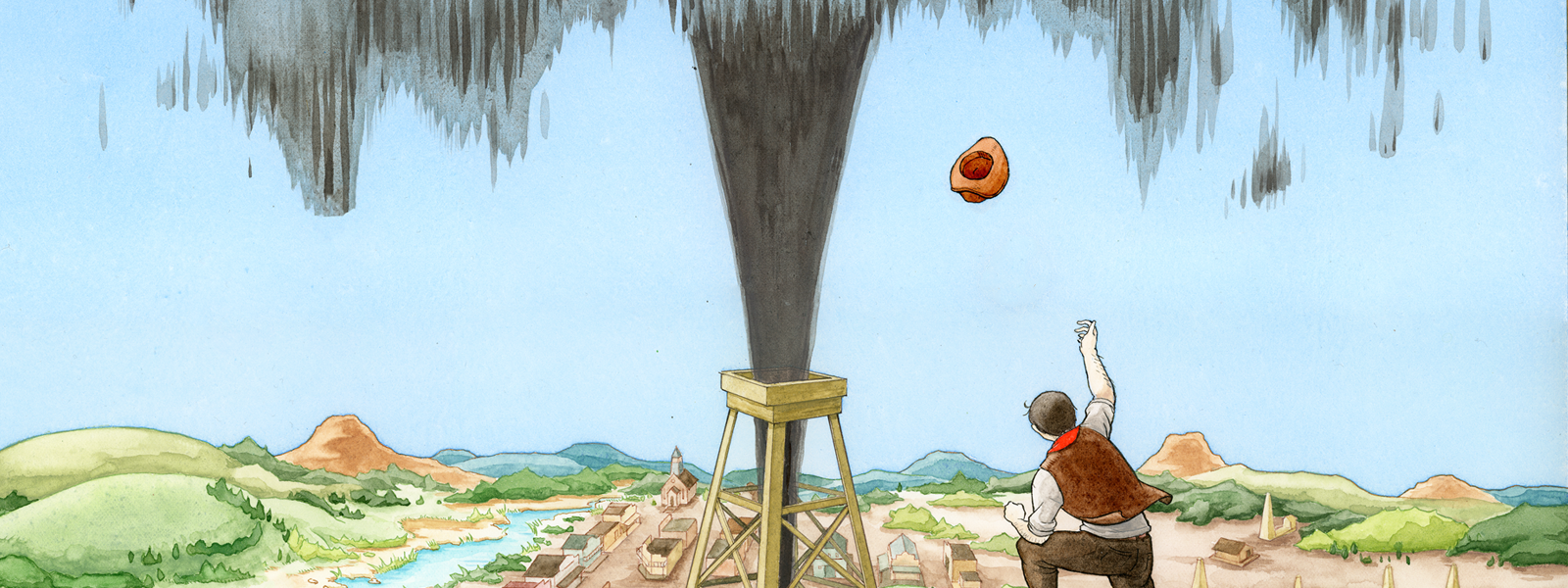 All artwork in Oil Town is hand-drawn with traditional watercolor technique on paper.
