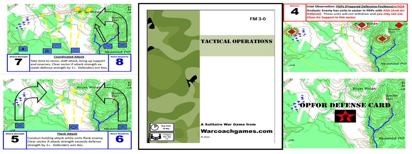 You are a Colonel trying to make General. Your big chance is to successful complete this mission against the OPFOR. It will take all of your knowledge of Tactical Operations to complete the mission in the time allowed. Succeed and you may get promoted. Fail and you may be relieved. OPFOR Tactical Op's is a fast playing, solitaire war game. You can play in under 10 minutes but you won't want to stop. It's addictive as you try and try to defeat the OPFOR and get that big promotion. Inspired by the work of the World Class OPFOR, Ft. Leavenworth.