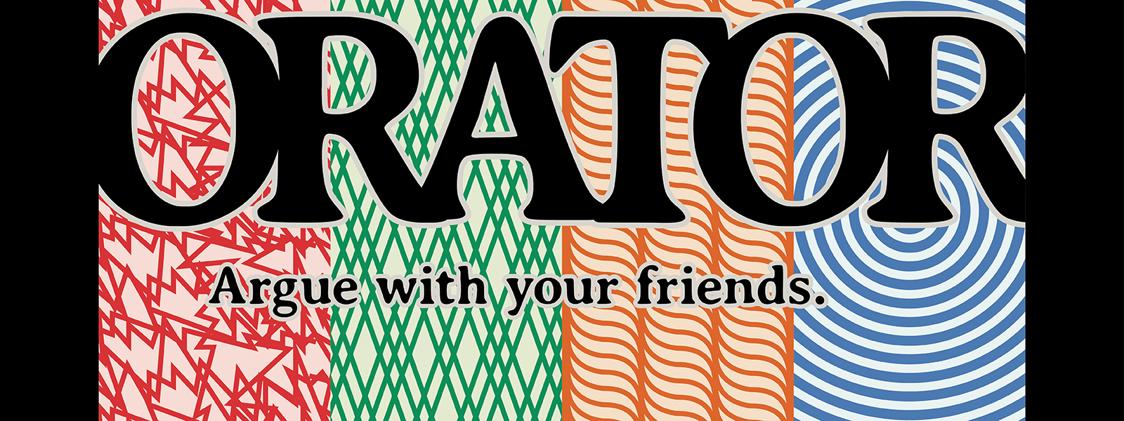 Game comes with 8 Orator cards, 2 Rules cards, and 80 Facts, Opinions, Fallacies, and Emotions.