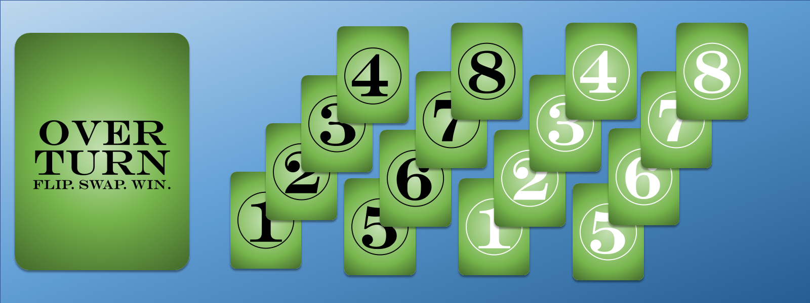 OverTurn usually takes about 15 minutes to play and is a perfect appetizer game or filler game. The portability of this 16 card game and the simplicity of the rules means it can easily be stuck in a pocket, pulled out any time, and taught to a casual game player in only a few minutes. Check out the full instructions below.