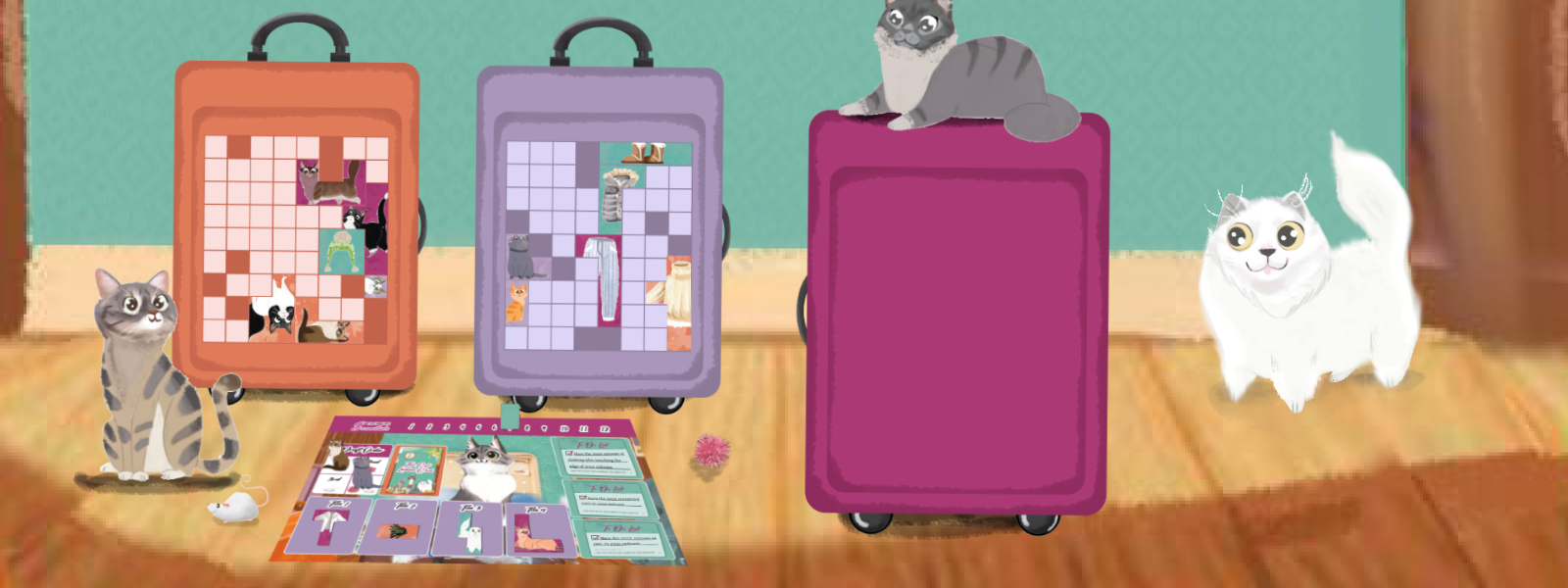 Straightforward and teachable in under 5 minutes, Pack the Essentials easy enough for new gamers and strategic enough for seasoned gamers to both have fun toghether. Each round has three simple parts. With two degrees of difficulty and multiple ways to score points, Pack the Essentials makes the purrr-fect game for cat loving players looking to dive in to a game that focuses more on strategy than luck.