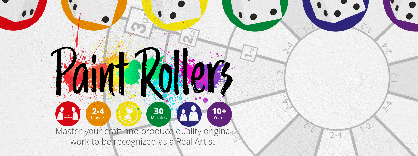 Paint Rollers is a roll and write and set collection game. Each turn players will roll dice in order to mix the colors they need to fill in their color wheels. Those paints will then be used to complete paintings from a central pile. At the end of the game, players add up points from paint and brush quality, painting size, style and more. The player with the highest score gets the title of “Real Artist”.