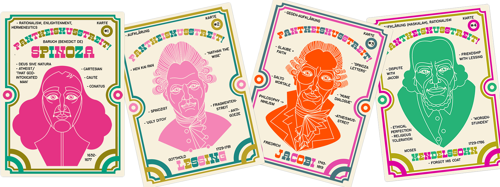 In the late 18th/early 19th century there was, in Germany, a controversy - the so-called 'Pantheism controvery, a.k.a. the Pantheismusstreit, a.k.a. the Spinoza controversy (quasi-distinct from the knock-on Atheismusstreit.) Everyone who was anyone got involved. My deck represents that. (Pantheism says: anyone IS everyone - or maybe the other way around? So, if pantheism is true, it's true. Worst case scenario: no one is anyone. But if that happens, at least we won't be around to be bothered by it. That's MY philosophy.)