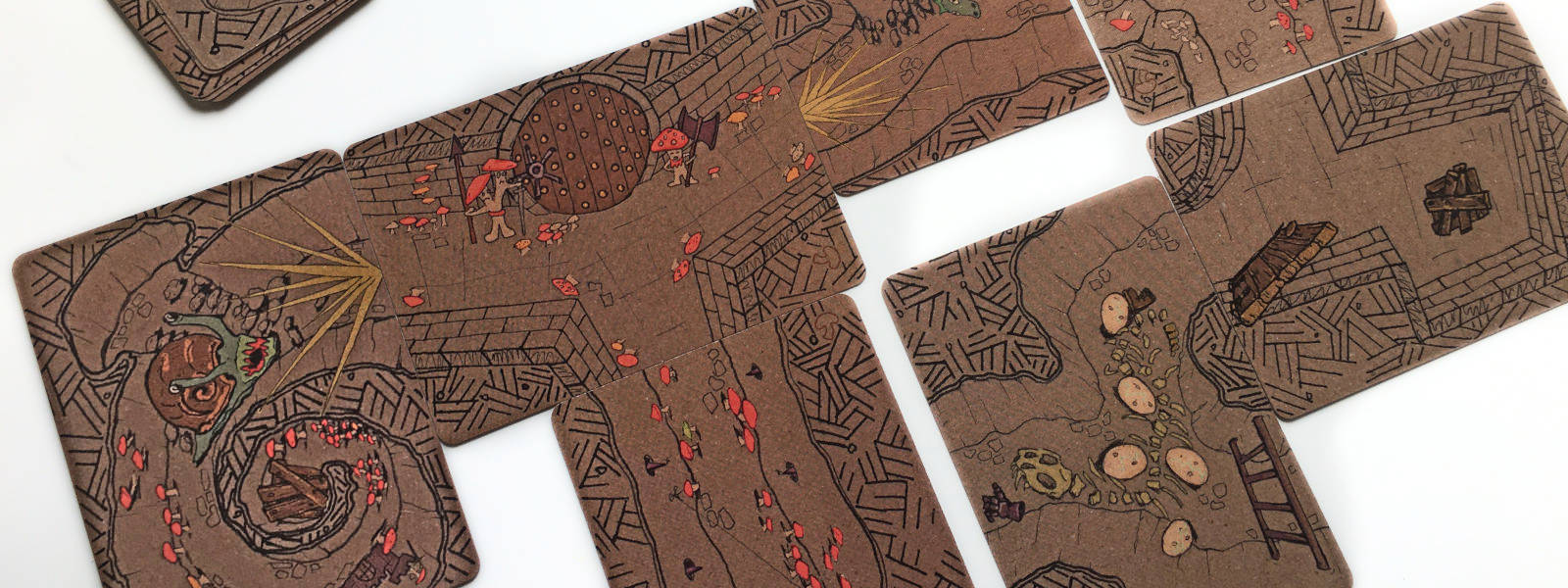 Mind the Mushrooms is an 18 card solitaire, tile-laying dungeon builder, with elements of "tower defense," hidden puzzles, and resource management.