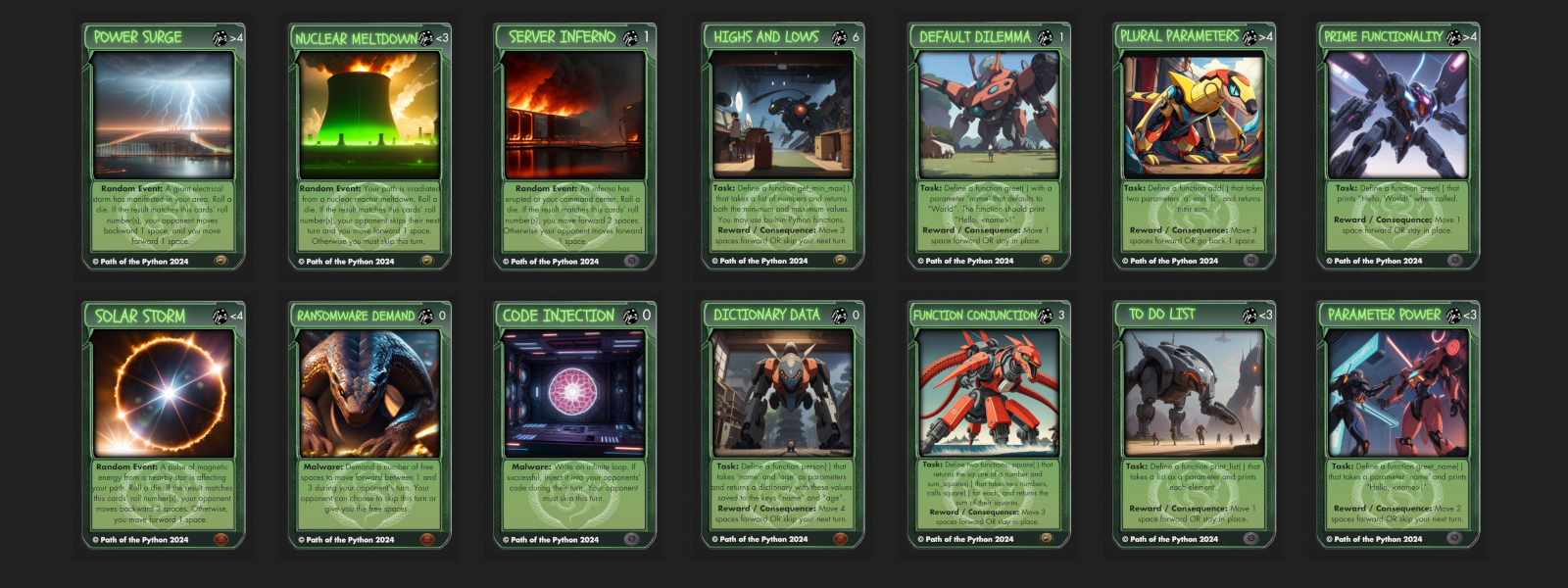 ➢ Card Task: On a player's turn, they draw a card and write code to meet the requirement instructions on the card, or follow any other instructions on the card.