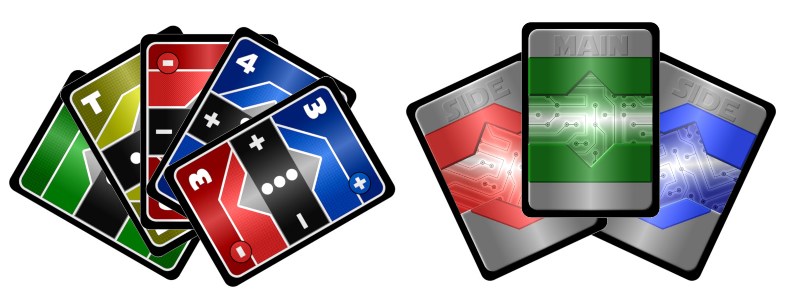 A reimagined style layout for a true classic, Pazaak: Sci-Fi Cantina is designed to be as colorblind friendly as possible for any species or ancestry. Each card front has distinct divided areas based on type (main, positive, negative, split, special) and side deck cards use a series of pips in the center so the value is always clear even when fully rotated.