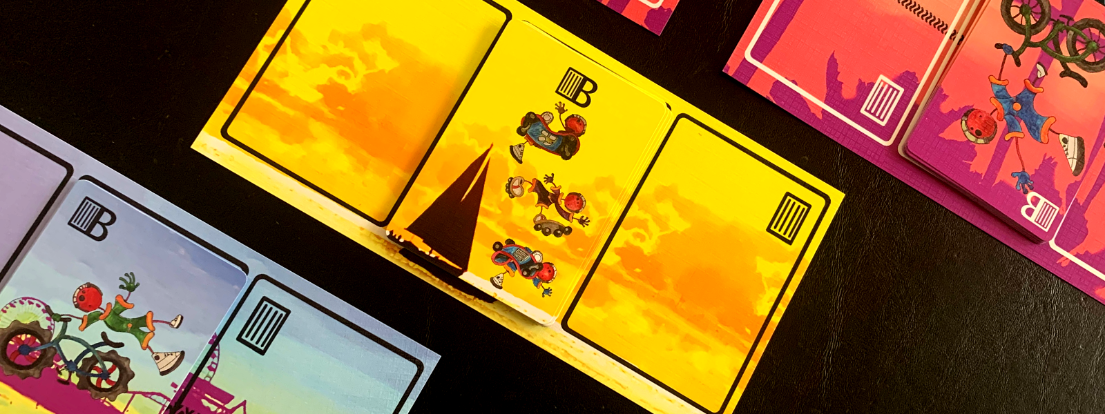 Pedal Beach is a two player bicycling themed game which players have a right and left deck of cards. These cards are manipulated to match and earn Goal cards in the center of play.