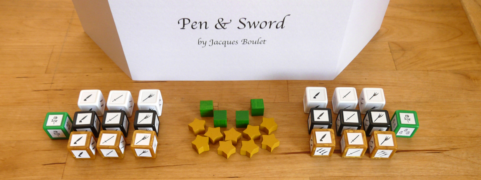 Pen & Sword is a quick-playing, easy-to-learn dice game for two players. Players begin each round by rolling their set of 10 dice behind their screen. They then play through 9 tricks until only one die is left. Games generally consist of 3 rounds. The first player to 14 points wins.