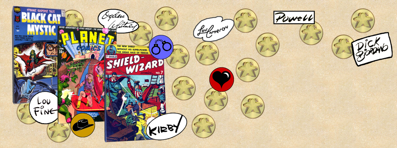 In Penny Galleria, you are competing to open the Golden Age Comic art gallery with the biggest draw. Create a gallery of Golden Age Comic cover art by spending your pennies to buy artwork from Artist's Row or buying art from other players. Mix and match comic genres and cover artists to create the best gallery and draw the most visitors on opening weekend or earn your money back by acting as an art broker to the other players. The player who earns the most pennies after three opening weekends wins! Whose gallery will bring in the most pennies?